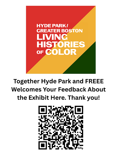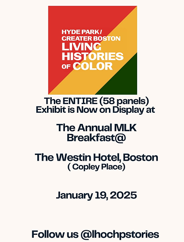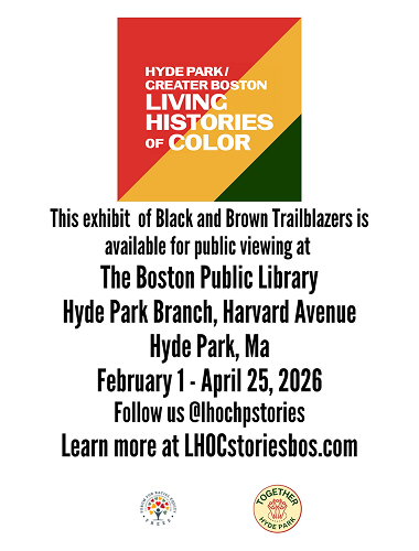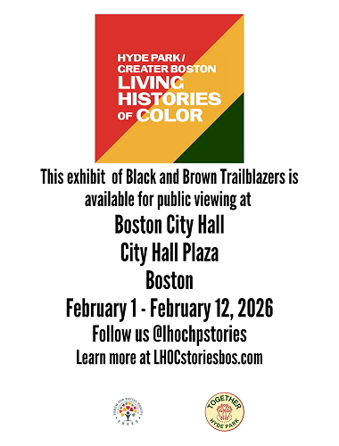 The Living Histories of Color of Hyde Park and Greater Boston exhibit is a pictorial, video, and narrative media installation of residents and leaders of Color who have made historical contributions locally and nationally. Curated by a local emerging artist from TogetherHydeparkma.org, in collaboration with Embrace Boston, the exhibit is unveiled each year during Juneteenth Celebrations, and travels throughout the City and State, to both showcase the cultural and social wealth of our neighborhoods, and educate the public about the complete contemporary history of Boston.